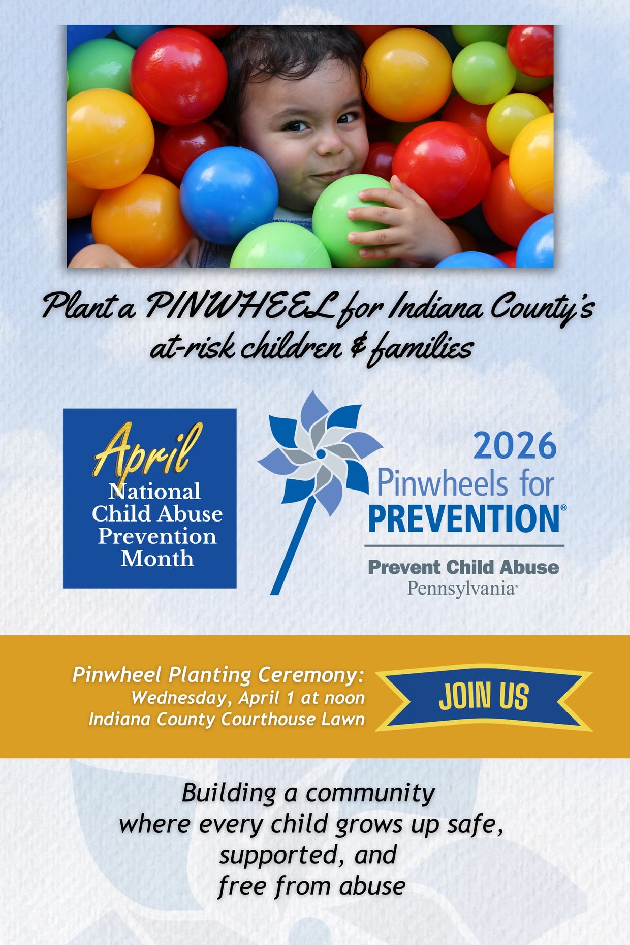 Every year during the month of April (which is National Child Abuse Prevention Month), The CARE Center of Indiana County hosts the Pinwheels for Prevention event. Local citizens, businesses, and organizations sponsor pinwheels at various donation amounts, and then our Pinwheel Garden of Hope goes on display on the lawn of the Indiana County Courthouse. YOUR ENTIRE DONATION STAYS RIGHT HERE IN INDIANA COUNTY, PENNSYLVANIA.